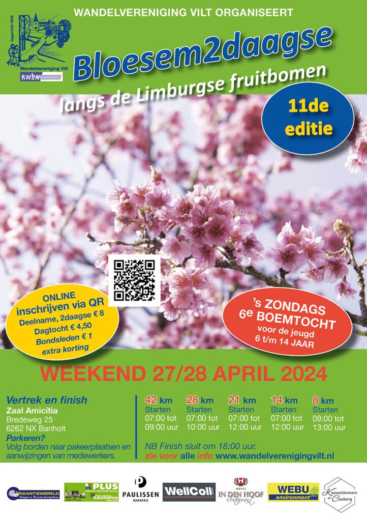 Na een nat en koud voorjaar was tijdens het weekend van onze Bloesem2Daagse helaas geen (of slechts zeer beperkt) bloesem meer aan de bomen. Toch waren er weer mooie routes uitgezet met een primeur voor onze Wandelvereniging; de inschrijvers voor de tweedaagse konden de routes van de 8 km. en van de 14 km. middels de beschikbare QR-code downloaden en via Komoot deze routes lopen.