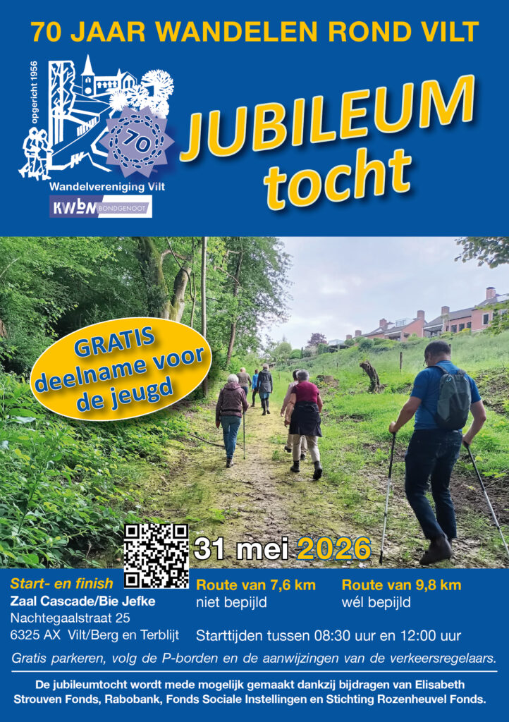70 jaar Wandelvereniging Vilt (1956 – 2026) betekent een jubileum dat wij vieren met een jubileumtocht. Hiervoor worden twee afstanden uitgezet, een route van 7,6 km. die met behulp van GPX of met een papieren beschrijving gelopen kan worden of een route van 9,8 km. die bepijld wordt. Beide routes gaan door de grotten van Geulhem (deze zijn normaal gesproken niet toegankelijk voor publiek!).